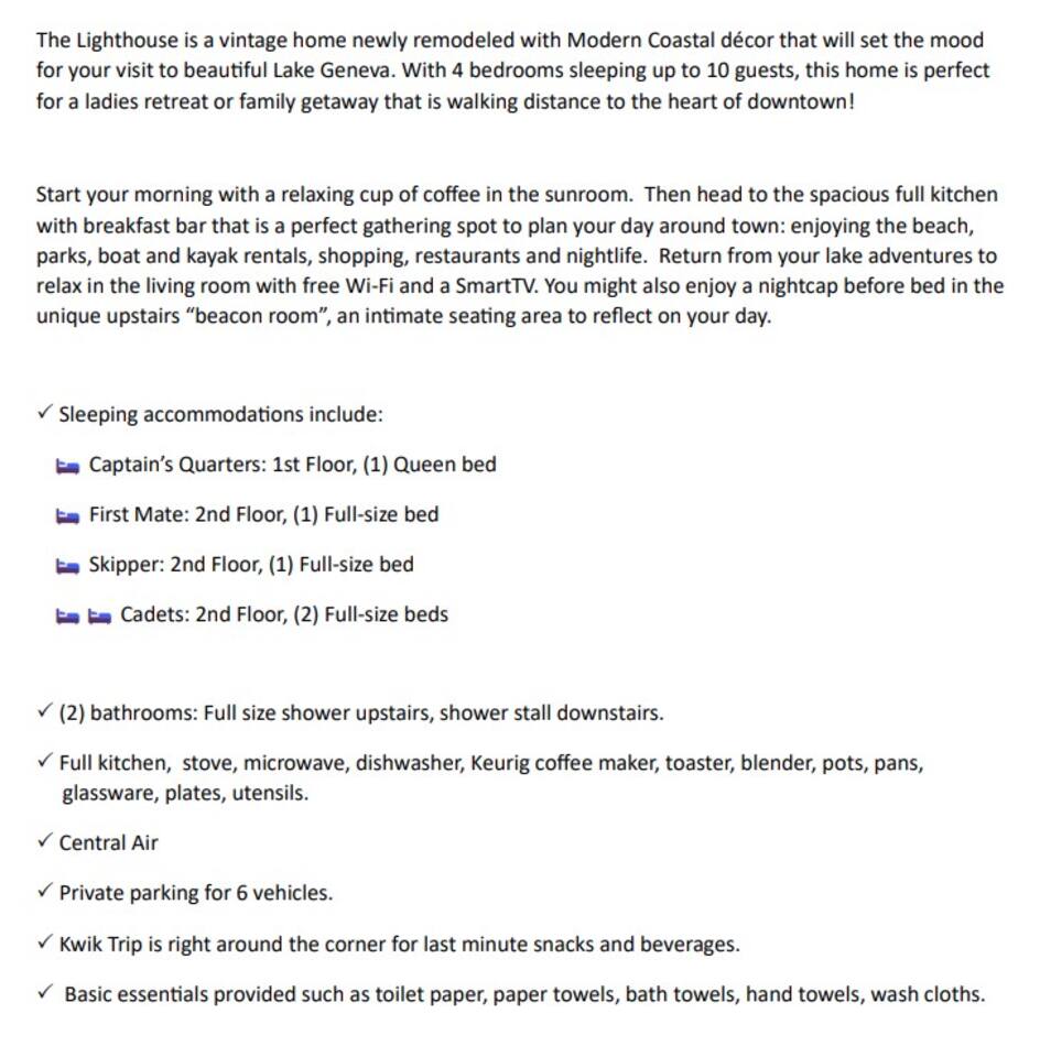 The Lighthouse is a vintage home newly remodeled with Modern Coastal décor that will set the mood for your visit to beautiful Lake Geneva, WI. 4 BR/7 Beds sleeping up to 10, perfect for a ladies retreat or family getaway. Walking distance to the heart of downtown! Start your morning with coffee in the sunroom, then gather in the Spacious Kitchen at the breakfast bar to plan your day around town. Relaxing living room w/free Wi-Fi & SmartTV. Enjoy a nightcap in the unique upstairs “beacon room”